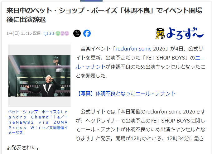 「ペット・ショップ・ボーイズ」ボーカルのニール・テナントの体調不良によりフェス急遽キャンセル。