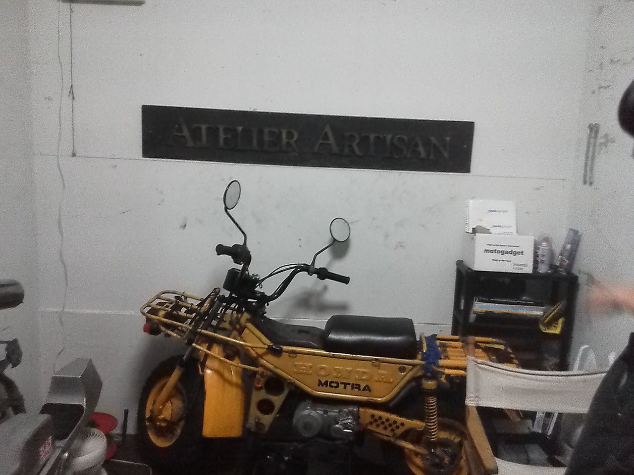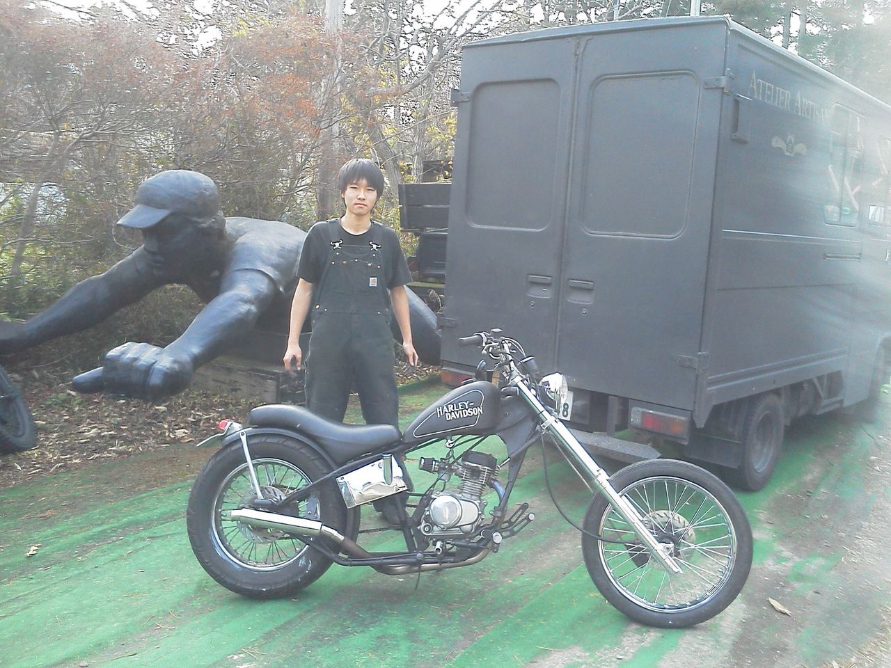 で、バイク大好き次男のユウセイ君と初対面。通学用の愛車はフレームがイタリアのショッパーにエイプのエンジンを載せたカスタム車。