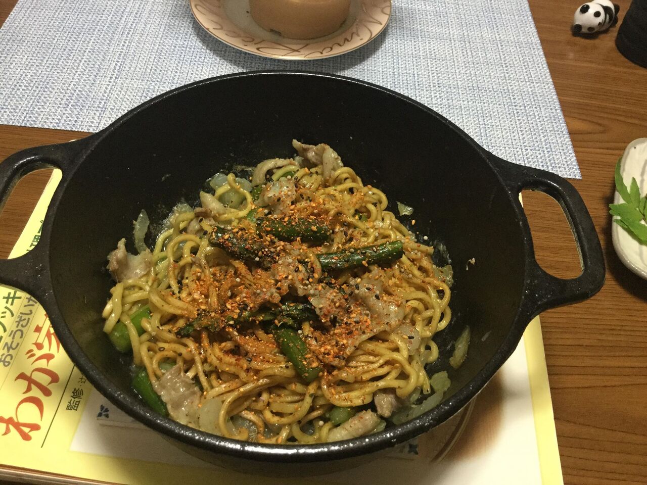 ずっと放置してたLODGEの鉄鍋を焼入れメンテナンスして、カレー焼きそば作った昨晩。