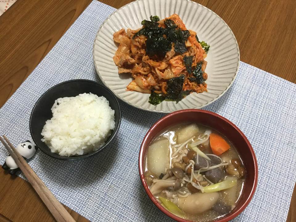 今日のチャンミカ定食....会津の新米、会津の芋煮、会津の女が作る豚キムチ。