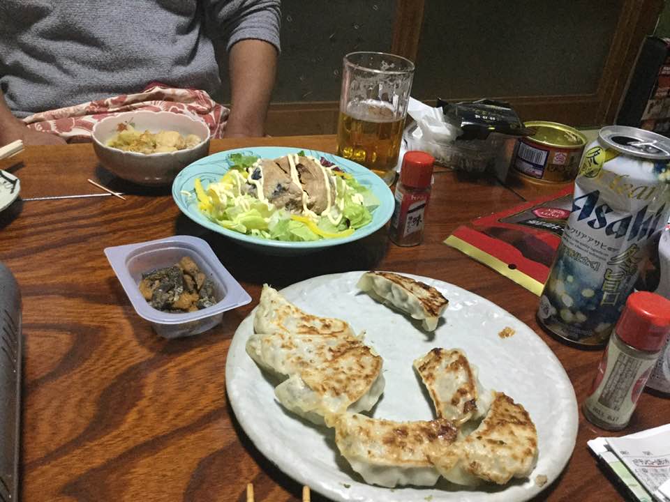 そして日曜夜、残り物の餃子と鍋でマー君と乾杯!