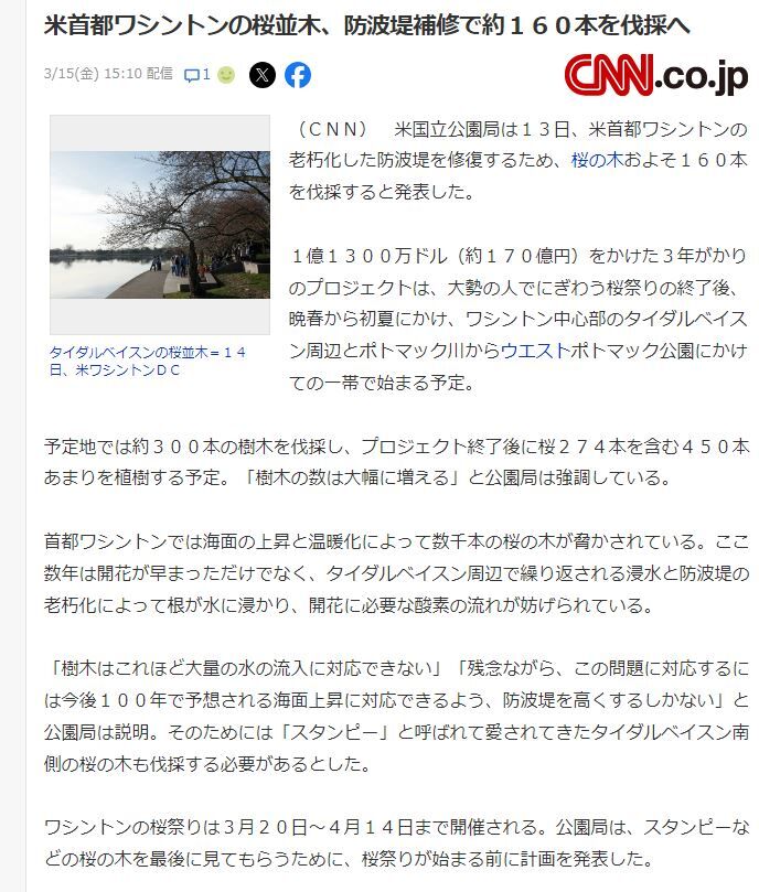 水面の上昇によって一帯はたびたび浸水していて、アメリカ国立公園局は、護岸工事のためおよそ160本の桜を近く伐採する計画だと明らかにしました。