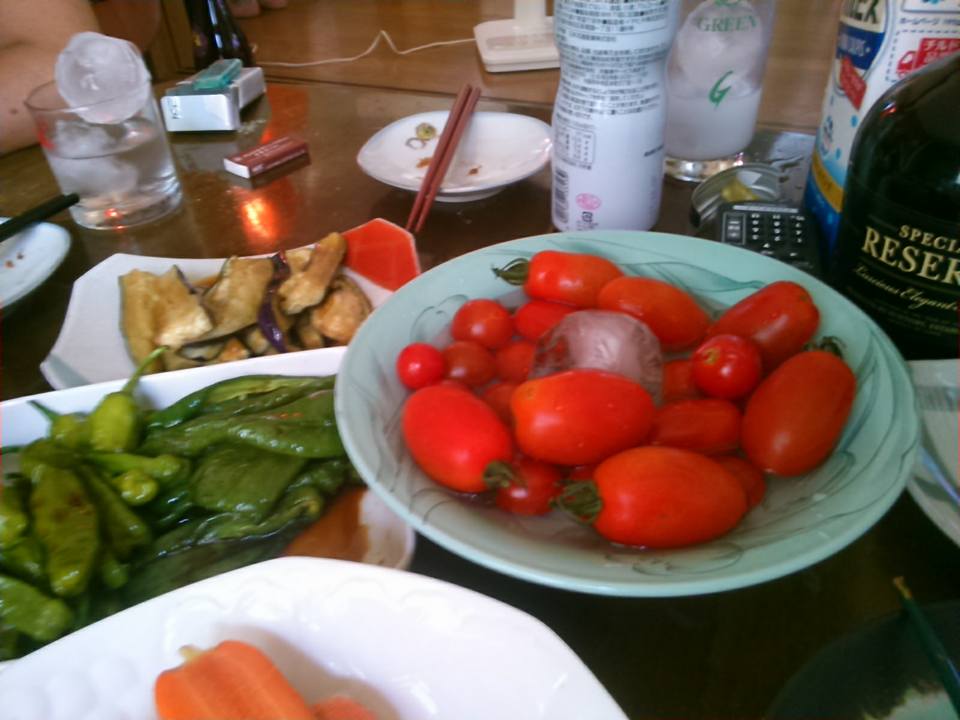 裏の畑からナスにトマトにシシトウ。